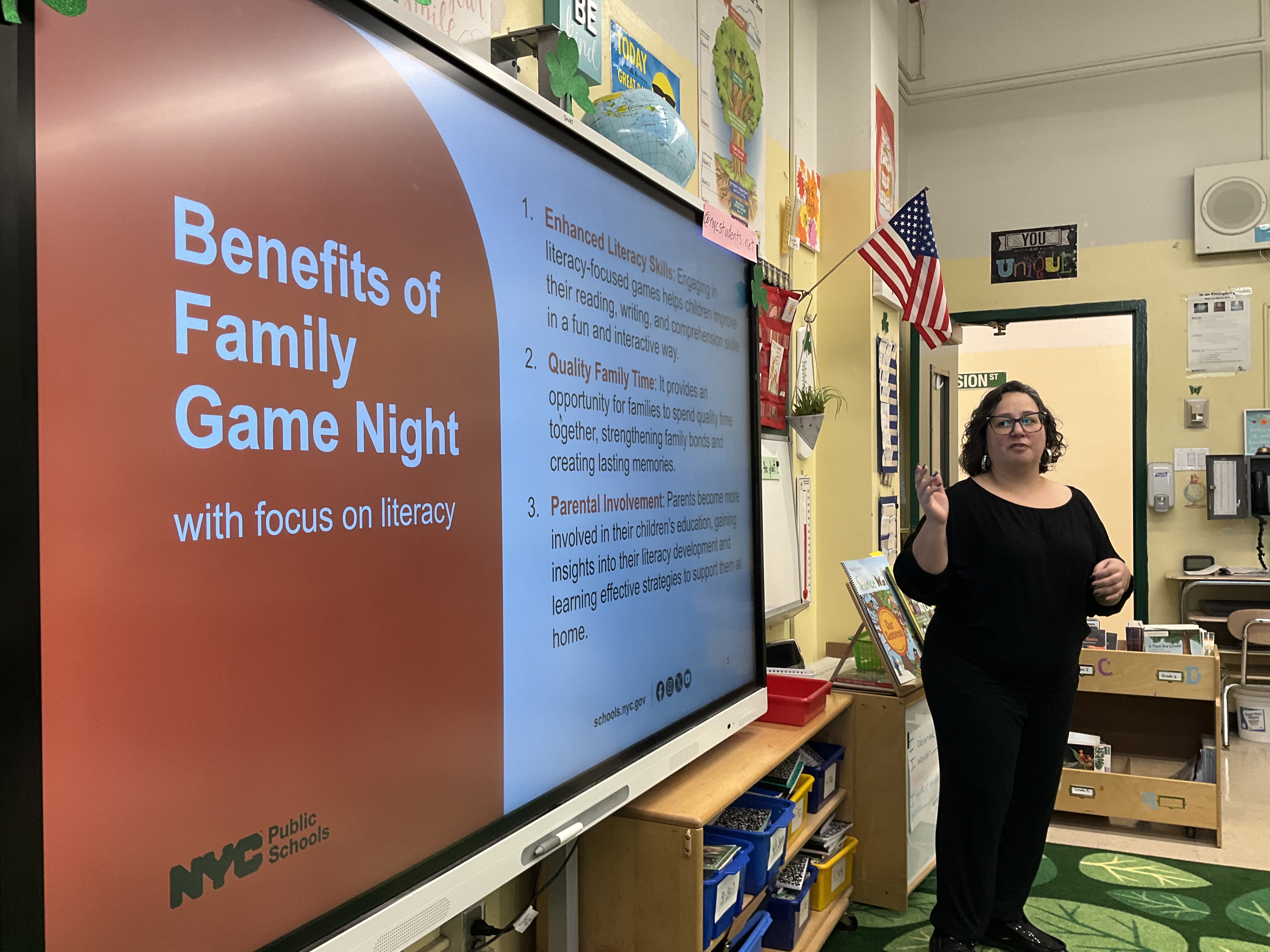 The workshop opened with remarks from Ms. Mazzeo, who is finishing her first year at P.S. 74. Her welcome set a warm and inclusive tone for the afternoon, emphasizing the importance of home-school partnerships in addressing the complex digital challenges children face today.